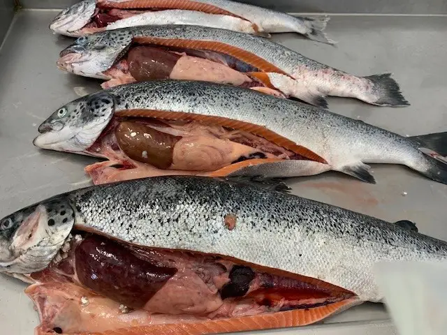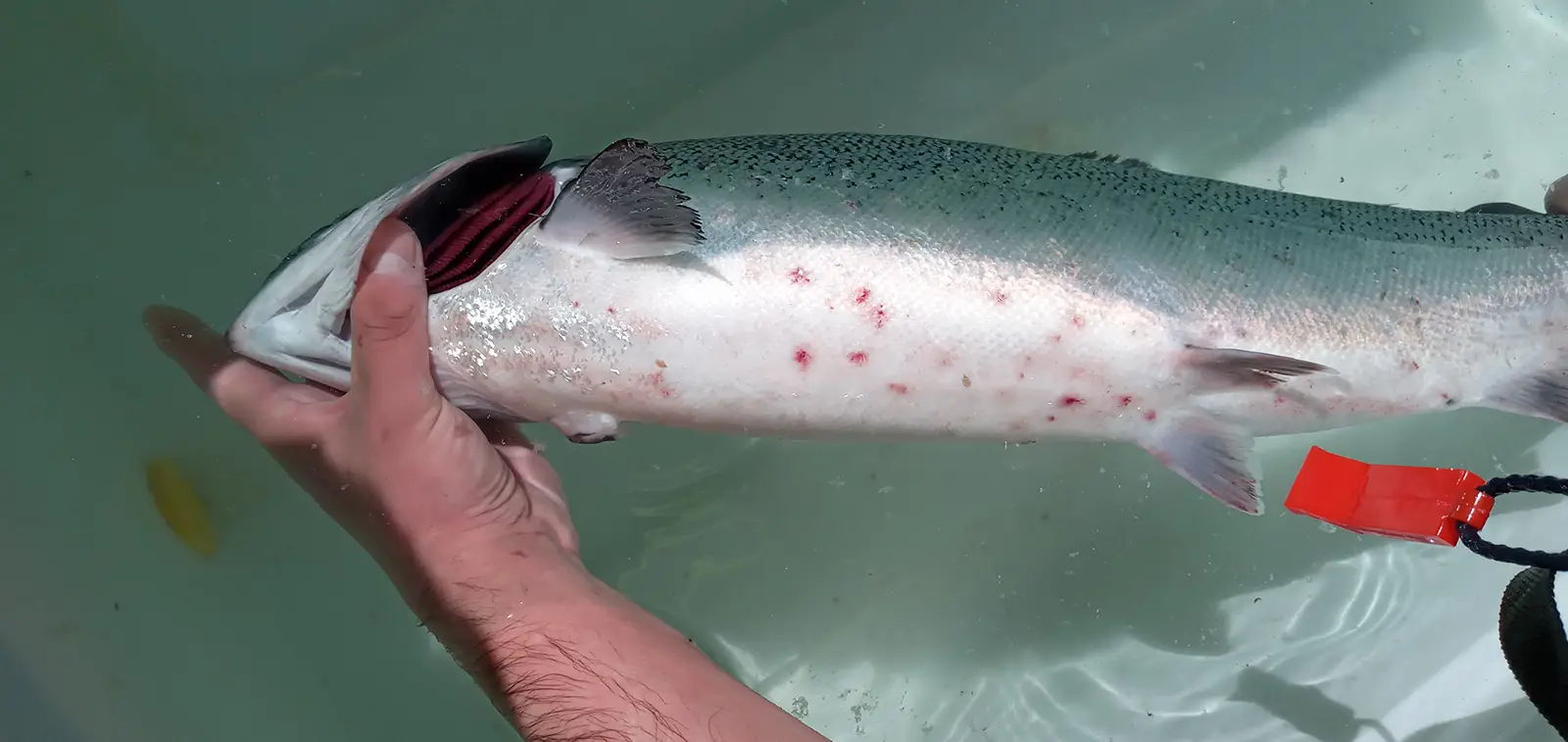 Visita veterinaria en terreno, necropsias, toma de muestras y realización de muestreos en peces (Score Branquial-Score Cataratas- Score-piel) y levantamiento de información productiva, con la entrega de informe visual sanitario y productivo al término de la asistencia.